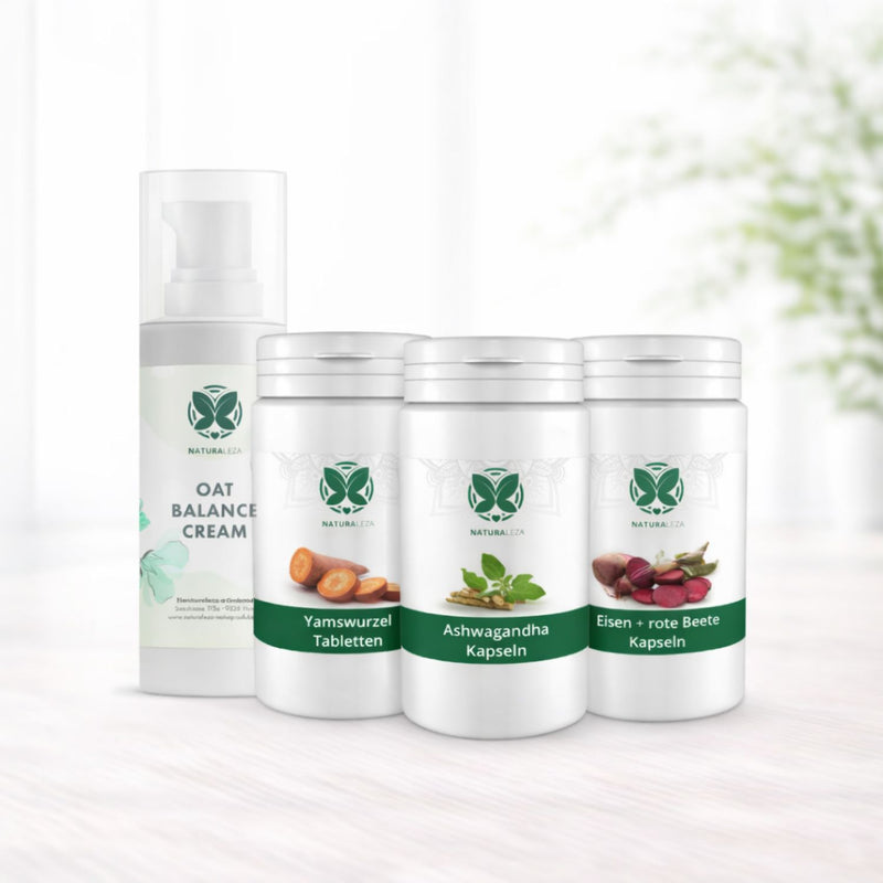 ✅ Enthält Yamswurzel Kapseln, Ashwagandha Kapseln, Eisen & Plus Kapseln sowie eine Gesichtspflege mit Haferextrakt.