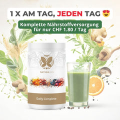 Mit Daily Complete bekommst du alles, was dein Körper täglich braucht, in einem erfrischenden Drink. ❌ Kein Pillen-Chaos, kein Vergessen, kein Stress. Nur 1 Glas pro Tag.