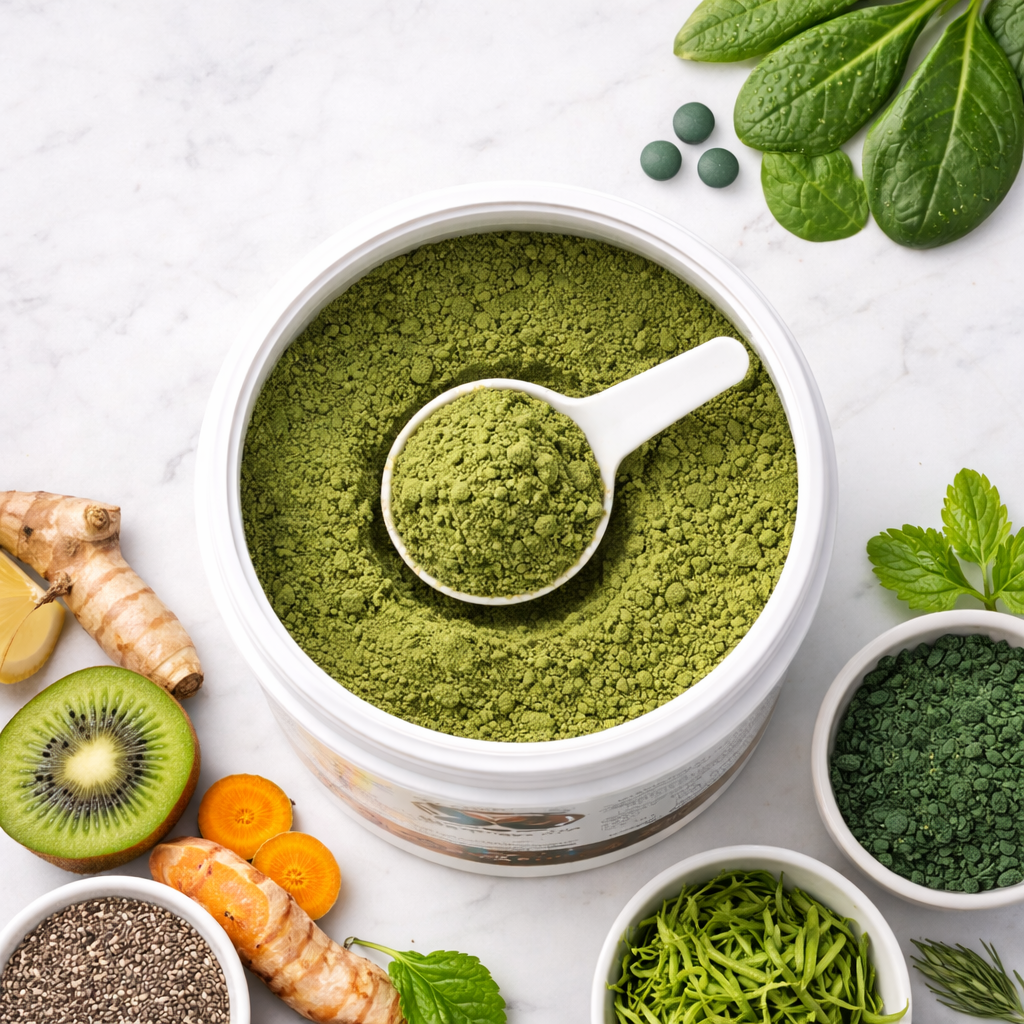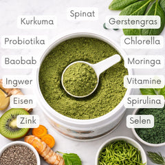 - Greens & Superfoods wie Moringa, Spirulina, Chlorella, Weizen- & Gerstengras