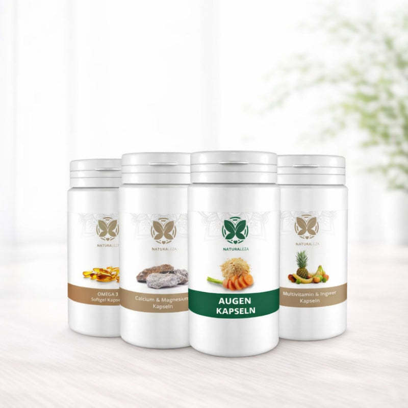 Mit diesem Bundle bekommst du alles, was du für eine umfassende Grundversorgung brauchst. Die Omega-3-Kapseln fördern Herz, Gehirn und Gelenke, während die Calcium-Magnesium-Kapseln deine Knochen und Muskeln unterstützen. Die Multivitamin & Bio Ingwer Kapseln liefern essentielle Vitamine und stärken das Immunsystem, und die Augen Kapseln sorgen mit gezielten Nährstoffen für klare Sicht und Augengesundheit. Dein Rundum-Paket für Energie, Gesundheit und ein vitales Leben – ideal für den täglichen Bedarf!